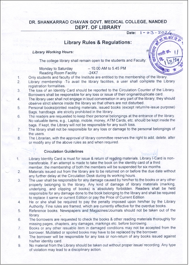 The Central Library of the institute occupies a place of pride in Dr. Shankarrao Chavan Government Medical College and Hospital and it is an essential component of the institute’s quality research and education mission. The state-of-the-art Central Library has a separate building and enables learning and advancement of knowledge.